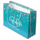 Uma bolsa de presente de 70 de aniversário elegante e glamourosa. Brilhante azul verde-lacrimejante cor verde-lacrimejante com borrifo de diamante sujo. Modelos de nome, 70 anos e data. Data de nascimento ou data da festa/aniversário. Letras brancas e lacrimejadas. O nome é escrito com um script de estilo manuscrito.