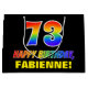 Este design de bolsa de presente colorida, alegre e divertida com tema de aniversário apresenta um grande número de "73" e a mensagem "FELIZ BIRTHDAY", ambos tendo um gradiente do espectro do arco-íris inspirado na coloração do padrão, juntamente com um nome ousado de destinatário personalizado amarelo. O fundo é preto colorido. Uma bolsa de presente divertida como esta pode ser usada quando se dá um presente ou presente em honra do 73º aniversário de alguém. [~Z0000477]