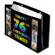 Este alegre e alegre design de bolsa de presente temático de aniversário apresenta a mensagem "FELIZ 76º ANIVERSÁRIO", com um padrão de gradação inspirado no espectro multicor do arco-íris, junto com um nome de destinatário editável. À esquerda e à direita da mensagem com padrão arco-íris na frente estão algumas fotos que podem ser personalizadas, talvez com fotos do receptor, da família e amigos do receptor e/ou do(s) remetente(s) do presente. Um saco-presente como este pode ser usado ao dar um presente em honra do setenta e seis anos de alguém. (Fotografia © Storytree Studios, Stanford, CA.) [~Z0000668]