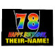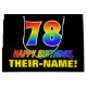 Esta design de bolsa de presente divertida, colorida e animada, com tema de aniversário, apresenta um grande número de "78" e a mensagem "FELIZ BIRTHDAY", ambas coloridas com um padrão inspirado no gradiente do espectro do arco-íris, juntamente com um nome ousado de destinatário personalizado amarelo. O fundo é preto colorido. Uma bolsa de presente divertida como esta pode ser usada ao embrulhar presentes que são dados a alguém em comemoração do seu 78º aniversário. [~Z0000477]