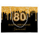 Um fundo preto chic. Decorado com pingos sujos de ouro, pintura pingando aparência. Personalize e adicione um nome. Com o texto: Parabéns. O nome é escrito com um script de estilo com letra de modo manual. O número 80 é gravado com uma fonte no estilo do balão.