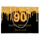 Um fundo preto chic. Decorado com pingos sujos de ouro, pintura pingando aparência. Personalize e adicione um nome. Com o texto: Parabéns. O nome é escrito com um script de estilo com letra de modo manual. O número 90 é gravado com uma fonte no estilo do balão.