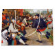 Pieter Bruegel, o Velho (1525-1530-9 de setembro de 1569), foi o artista mais significativo da pintura Renascentista holandesa e flamenga, pintor e impressora de Brabant, conhecida por suas paisagens e cenas camponesas (a chamada pintura do gênero); foi pioneiro no fazer tipos de assunto em foco em grandes pinturas. Os historiadores da arte pensam que ele era nascer em Breda ou Breugel (uma aldeia no município de Son en Breugel), ambos localizados na atual província holandesa do Brabante do Norte. Ele exerceu uma influência formativa na pintura holandesa da idade do Ouro e, mais tarde, pintou em geral em suas escolhas inovadoras de matéria, como uma das primeiras gerações de artistas a crescer quando os súditos religiosos deixavam de ser objeto natural de pintura. Ele também não pintou retratos, o outro esteio da arte holandesa. Após sua formação e viagens à Itália, ele voltou em 1555 para se estabelecer em Antuérpia, onde trabalhava principalmente como prolífico designer de impressões para a principal editora do dia. Somente no final da década ele se mudou para fazer a pintura do seu meio principal, e todas as suas famosas pinturas vêm do período seguinte, pouco mais de uma década antes de sua morte inicial, quando ele provavelmente estava no início dos anos 1940, e no auge de seus poderes. Além de olhar para frente, sua arte revigora assuntos medievais como sondas marginais da vida normal em manuscritos iluminados, cenas de calendário de trabalhos agrícolas em paisagens, e as coloca em escala muito maior do que antes, e no caro meio de pintura a óleo. Ele faz o mesmo com o mundo fantástico e anárquico desenvolvido em impressões e ilustrações de livros da Renascença. Citação: Wikipedia