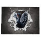 À sombra da elegância: Um cisne negro. Um majestoso cisne preto, suas asas esticadas exibidas no esplendor do cheio, com um gradiente de cor harmonioso de tons pretos profundos a cinzas suaves, ressaltando a elegância e graça do cisne. O pescoço longo do cisne é graciosamente curvo, dando à composição um movimento dinâmico. Seu bico vermelho forma um contraste impressionante com os tons escuros do corpo.