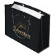 Saco de presente grande com ilustração dourada sobre fundo de cinza preta. Projetado com uma ilustração de uma montanha com raios solares brilhando por trás. A tipografia diz: "A vida é uma descoberta de sonho de uma Aventura".