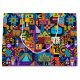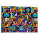 Color Palette: Extremely vibrant and diverse: Deep Purple, Bright Yellow, Electric Blue, Orange, Red, and Black.