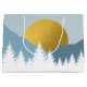 Uma bela design que mostra uma floresta coberta de neve, paisagem de montanha e um pôr do sol ou nascer do sol ouro refletindo na água. Os tons coloridos incluem tons neutros, como azul, branco e ouro. Um design rústico ideal para decoração caseira de inverno e estação festiva de férias.