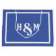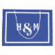 As iniciais da noiva e do noivo e o saco-presente grande. Azul claro com texto de bloco branco dentro de uma borda branca.