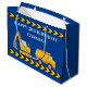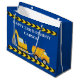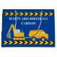 Legal saco de presentes azul festa de aniversário para uma criança que ama veículos de construção amarelos em preto e amarelo. A decoração divertida de festas de veículos para um garotinho que amará carros e caminhões. Personalize com o nome do seu filho sob a fita de precaução preto e amarelo.