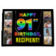 Este design de presente de aniversário alegre e alegre apresenta a mensagem "FELIZ 91RUAS ANIVERSÁRIO", com um vibrante espectro multicolorido do arco-íris inspirado em um padrão de gradiente inspirado, junto com um nome de destinatário personalizado. As fotos à esquerda e à direita da mensagem com formato arco-íris na frente do cartão podem ser personalizadas, talvez com fotos do receptor, da família e dos amigos do destinatário e/ou do(s) remetente(s) do presente. Um saco de presentes como este pode ser usado ao embrulhar presentes ou presentes sendo dados a alguém em comemoração de seu 91º aniversário. (Fotografia © Storytree Studios, Stanford, CA.) [~Z0000668]