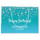 Uma bolsa de presente de aniversário elegante e glamourosa. Brilhante azul verde-lacrimejante cor verde-lacrimejante com borrifo de diamante sujo. Com o texto: Feliz Aniversário! Modelos para um nome e uma data. Data de nascimento ou data da festa/aniversário. Cartas brancas.