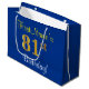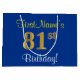 Este simples e elegante design de presente de aniversário apresenta uma mensagem personalizada, como "FirstName’s 81rua Birthday!" (com a "81ruas" a ter um visual falsa/imitado de cor dourada) sobre um fundo de cor azul. O nome está em texto amarelo, parecido com script, e pode ser personalizado. Um saco de presente de aniversário personalizado como este poderia talvez ser usado ao dar um presente ou presente a alguém que comemora seu oitenta aniversário. [~Z0000260]