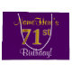 Este simples e elegante design de presente de aniversário apresenta uma mensagem personalizada, como "NameHere's 71rua Birthday!" (com a "71ruas" a ter uma aparência falsa e imitada de cor dourada) sobre um fundo cor roxo. O nome está em texto amarelo, parecido com script, e pode ser personalizado. Uma bolsa de presente personalizada de aniversário como esta poderia talvez ser usada quando se dá um presente ou presente a alguém que comemora seu setenta e primeiro aniversário. [~Z0000255]