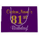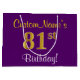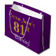 Este simples e elegante design de presente de aniversário apresenta uma mensagem personalizada, como "81ruas Birthday!" (com a "81ruas" a ter um visual falsa/imitado de cor dourada) sobre um fundo cor roxa. O nome está em texto amarelo, parecido com script, e pode ser personalizado. Uma bolsa de presente personalizada de aniversário como esta poderia talvez ser usada quando se dá um presente ou presente a alguém que comemora seu oitenta aniversário. [~Z0000255]