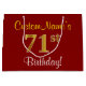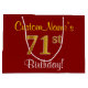 Este simples e elegante design de presente de aniversário apresenta uma mensagem personalizada, como "CustomName’s 71rua Birthday!" (com a "71ruas" a ter um visual falsa/imitado de cor dourada) sobre um fundo vermelho colorido. O nome está em texto amarelo, parecido com script, e pode ser personalizado. Um saco de presente de aniversário personalizado como este poderia talvez ser usado ao dar um presente ou presente a alguém que comemora seu setenta e primeiro aniversário. [~Z0000253]