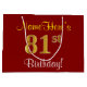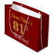 Este simples e elegante design de presente de aniversário apresenta uma mensagem personalizada como "NameHere's 81rua Birthday!" (com a "81ruas" a ter um visual falsa/imitado de cor dourada) sobre um fundo de cor vermelha. O nome está em texto amarelo, parecido com script, e pode ser personalizado. Um saco de presente de aniversário personalizado como este poderia talvez ser usado ao dar um presente ou presente a alguém que comemora seu oitenta aniversário. [~Z0000253]