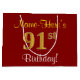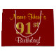 Este simples e elegante design de presente de aniversário apresenta uma mensagem personalizada como "Aniversário do 91rua do Nome-Aqui!" (com a "91ruas" a ter um visual falsa/imitado de cor dourada) sobre um fundo de cor vermelha. O nome está em texto amarelo, parecido com script, e pode ser personalizado. Um saco de presente de aniversário personalizado como este poderia talvez ser usado quando se dá um presente ou presente a alguém que comemora o seu 90º aniversário. [~Z0000253]