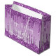 Um saco de presente para um aniversário de 21 ruas (ou qualquer idade) feminino e glamouroso. Um fundo de gradiente roxo com brilho de falso roxo profundo, aparência de pingar. Escrito com letras brancas e o texto: Feliz Aniversário. Personalize e adicione um nome.