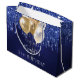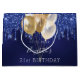 Um saco de presente para um aniversário de 21 ruas (ou qualquer idade) feminino e glamouroso. Um fundo azul marinho decorado com gotas de brilho e balões de ouro. A cor azul é irregular. Personalize e adicione uma data, nome e idade 21. O texto: O nome é escrito em branco com um script de estilo moderno, escrito à mão