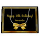 Dois quadros elegantes de ouro falso e um fundo preto chic. Com o texto: Feliz 50º aniversário! Modelo para o nome dela, cartas de ouro. Decorado com um arco elegante de cor ouro.