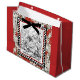 Grande saco vermelho brilhante com uma Alice branca e preta na imagem de Wonderland, na frente, de Alice sob ataque dos Cartões em uma armação de pranchas de xadrez preto e branco sobre um fundo de cartas de jogar em vermelho. Arco preto opcional. Veja o saco de presentes médio correspondente, convite, envelope, caixa de favor, etiqueta de favor quadrada, etiqueta, adesivo quadrado e papel de embalagem. Veja toda a coleção Wonderland Gift Bag nos TOUCHES ESPECIAIS | Seção Favoritos para festas.
