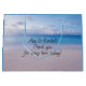 Saco de boas-vindas de papel com uma cena de praia. Personalize o texto preto impresso na frente aos convidados do obrigado para participar de um casamento no mar. Água do oceano azul e areia lisa são as imagens de ambos os lados. Feita para um casamento, mas esta design funciona para aniversários e outros eventos também. O texto pode ser removido.