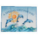 Dar presente nunca foi tão fácil! Este grande e brilhante saco de presentes é facilmente personalizado com as suas próprias mensagens (lê-se atualmente: Um presente especial para vós) e apresenta três golfinhos salientes nas ondas do oceano e um sol ouro atrás deles.
