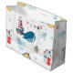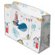 Um saco de presente náutico com tema balístico, com baleia, farol e polvo. Perfeito para aniversários ou chás de fraldas.