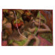 This design features a painting by the French Impressionist artist Edgar Degas (1834–1917). It captures a quiet, intimate moment behind the scenes of the ballet, far from the glamour of the stage. Painted late in Degas’s career, when he increasingly favoured pastel as his primary medium, the work reflects his enduring fascination with dancers, not as ethereal performers but as real women engaged in the physical routines of their craft. In this piece, the ballerinas are shown in the midst of preparation, absorbed in the act of adjusting their colorful costumes. Their gestures, though ordinary and mundane, are imbued with a kind of grace and rhythm that reveal Degas’s profound sensitivity to movement. The viewer is positioned almost as an unseen observer, witnessing the dancers in a private, transitional moment between rehearsal and performance. The pastel technique also lends the scene a softness and immediacy that oil paint might not achieve. The composition, cropped closely and viewed from an oblique angle, feels almost photographic, echoing Degas’s fascination with the new visual technologies of his time. More than a mere depiction of dancers, the painting is a study of preparation and discipline, revealing the hard work that underlies the elegance of ballet. Degas’s gaze is at once tender and analytical: he neither romanticizes nor objectifies his subjects but treats them as workers absorbed in their own world. The work also resonates with a sense of introspection, perhaps even nostalgia, for a subject that had defined much of his artistic life. The original artwork was painted by Edgar Degas circa 1899.
