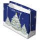 Saco os presentes de Natal com este Saco de Presente de Árvore de Natal Azul e caprichoso. Design de saco de presente apresenta um trio de neve coberta de árvores de Natal decoradas contra fundo azul e flocos de neve. Itens adicionais de presentes e feriados disponíveis com este design também.