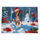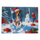 Uma ilustração animadora de feriado mostrando um cachorro alegre brincando na neve, vestindo um chapéu de Papai Noel e cercado por caixas coloridas de presentes. Ao fundo, as crianças constroem um boneco de neve ao lado de uma árvore de Natal coberta de neve, criando uma alegre terra maravilhosa do inverno. Perfeito por espalhar alegria e capturar a magia do Natal.