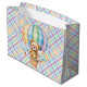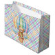 Um Grande Saco De Presente Para Um Chá de fraldas Projetado Em Xadrez De Pastel E Balão De Ar Quente Com Urso Bebê