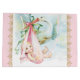 Saco de presente de chá de fraldas com cegonista vintage e menina em um fundo bonito rosa e de renda dourada. Esta bolsa de presentes para bebês cegos é facilmente personalizada com texto, e você pode mudar a cor de fundo.