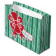 Um grande arco vermelho enfeita este aqua e uma bolsa de presente de feriado verde. Esta bolsa é excelente para todas as idades. O design é da arte original.
