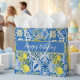 Bring a touch of French Country charm to your gift giving with this elegant gift bag featuring a vibrant French country blue tile pattern accented by lush yellow lemons. The design includes a stylish band that can be personalized with a name, your initials or a saying, making it a refreshing and custom addition to all your gift giving.
