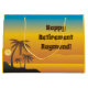 Feliz aposentadoria com uma cena de praia em ouro e azul com palmeiras em uma ilha e fontes elegantes. Edite o texto para seu convidado de honra. Divertido para seu colega de trabalho amante da praia ou qualquer festa de aposentadoria.