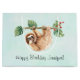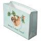 Saco de presentes com uma preguiça adorável pendurada de cabeça para baixo de um galho de árvore. Ramo de árvore é decorado com folhas e bagas tropicais. Colocado sobre um fundo verde-claro.