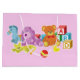 Essas bonecas adoráveis e coloridas estão prontas para jogar! Há um cavalo azul, cachorro roxo, gato amarelo, ursinho de pelúcia, pato de borracha, bola de salada, e cubos ABC. Este design pode ser personalizado ou personalizado adicionando seu próprio texto e imagens.
