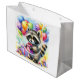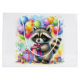 Docinho guaxinim com um presente de aniversário cercado por balões de aniversário em azul, amarelo, verde, roxo e rosa. Saco de presente personalizado.