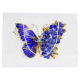 Borboleta de flores cinza, azul, safira, espumante com asa decorada com flores preciosos azuis com folhas de ouro sobre fundo branco.