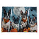 Libere o espírito assustador com esta design sombria do Dia das Bruxas apresentando um bando de cachorros sob um céu escuro e iluminado, cercado por morcegos voadores e abóboras brilhantes. Perfeito para aqueles que amam um toque de diversão terrível com seus amigos peludos!