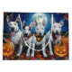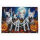 Libere o espírito assustador com esta design sombria do Dia das Bruxas apresentando um bando de cachorros sob um céu escuro e iluminado, cercado por morcegos voadores e abóboras brilhantes. Perfeito para aqueles que amam um toque de diversão terrível com seus amigos peludos!