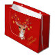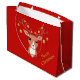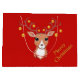 Veado de Natal bonito no centro em saco de prenda vermelho. A rena é decorada com bolas de ouro.