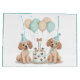 Uma bela ilustração cartoon dos cães de Poodle Standard vestindo um chapéu de aniversário em volta de um bolo de aniversário e balões. Perfeito para amantes de animais de estimação ou pais de cães.