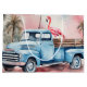 Caminhão de coleta azul retrógrado com flamingo e palmeiras