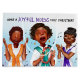 Uma trio afro-americana vestida de branco com cinzas coloridas individualmente cantando elogios para as férias, fazer um barulho alegre com mãos, voz e instrumentação.