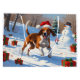 Uma ilustração festiva de férias com um cão alegre brincando na neve, usando um chapéu de Papai Noel e cercado por caixas de presentes coloridas. Ao fundo, crianças constroem um boneco de neve ao lado de uma árvore de Natal coberta de neve, criando um alegre país das maravilhas de inverno. Perfeito para espalhar alegria natalina e capturar a magia do Natal.