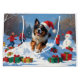 Uma ilustração animadora de feriado mostrando um cachorro alegre brincando na neve, vestindo um chapéu de Papai Noel e cercado por caixas coloridas de presentes. Ao fundo, as crianças constroem um boneco de neve ao lado de uma árvore de Natal coberta de neve, criando uma alegre terra maravilhosa do inverno. Perfeito por espalhar alegria e capturar a magia do Natal.