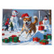 Uma ilustração animadora de feriado mostrando um cachorro alegre brincando na neve, vestindo um chapéu de Papai Noel e cercado por caixas coloridas de presentes. Ao fundo, as crianças constroem um boneco de neve ao lado de uma árvore de Natal coberta de neve, criando uma alegre terra maravilhosa do inverno. Perfeito por espalhar alegria e capturar a magia do Natal.