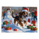 Uma ilustração animadora de feriado mostrando um cachorro alegre brincando na neve, vestindo um chapéu de Papai Noel e cercado por caixas coloridas de presentes. Ao fundo, as crianças constroem um boneco de neve ao lado de uma árvore de Natal coberta de neve, criando uma alegre terra maravilhosa do inverno. Perfeito por espalhar alegria e capturar a magia do Natal.